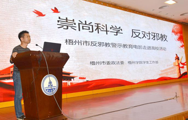 10月20日,广西梧州市万秀区防范办将反邪教警示教育电影《识破全能神》送进梧州学院学术报告厅。