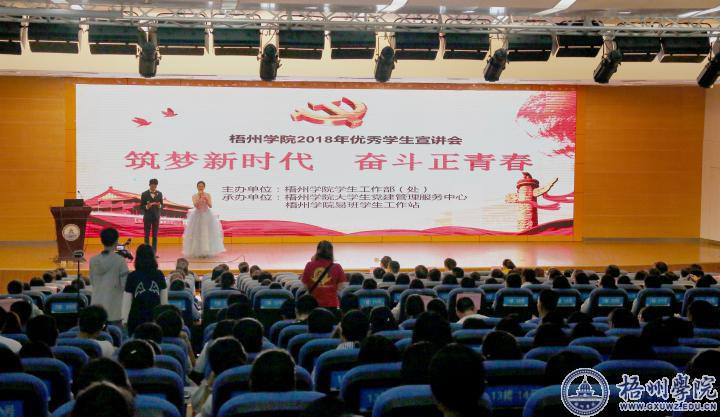 10月20日上午,以“筑梦新时代,奋斗正青春”为主题的梧州学院2018年优秀学生宣讲会在明理楼学术报告厅拉开帷幕。学生工作部主要领导、各二级学院副书记出席宣讲会,各学生社团组织、2018级新生班代表参加了本次宣讲会。 宣讲会上,优秀党员组的陈添祥以自己的经历,建议2018级同学入党要趁早,心要诚,信念要坚定,鼓励2018级同学要有“不忘初心,把握今天,拼搏明天”的心态;优秀志愿者组的陆春花以发现力量、触摸力量、传递力量为主线,以服务福利院老奶奶的亲身经历为引子做了题为《做有力量的人》的宣讲,给在座的师生心灵上播下了友善的种子;优秀学生干部组的苏海梅以自己的事例鼓励新生们不要害怕别人的否定,要相信自己,要在压力中成长,在否定中超越自我;社团积极分子组的董一平分享了自己在大学几年的社团活动与收获,引导新生们要不忘初心、心怀感恩,低调做人高调做事,敢于担当、弘扬正能量,追求不一样的自己;优秀学生干部组的彭祥轩认为学生干部就要勇于担当、身先士卒、淡泊名利、鼓舞同学、全心全意为同学服务;励志自强代表组的叶志峰以自己男幼师的求学经历,通过活泼的语言向同学们分享了他的“坚定专业,持之以恒;发展兴趣,全面发展;相信一切皆有可能”三个成功小锦囊和大学心得;优秀志愿者组的王慧珠通过分享自己将近7年的志愿之旅的点滴,让同学们再次感受到奉献、友善的力量。 宣讲会穿插了大学生艺术团管乐队的表演,也让大家感受了乐曲的魅力。 [文:陈玫岑、谢燕妮;图:杨春榕、黄林、栗明慧、黄凤娇]