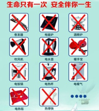 以上这些给寝室安全管理特别是用电安全敲响了警钟。火灾都是因为使用违章电器而引发,给住宿学生造成了重大影响。为了住宿同学的生命财产安全,宿舍内严禁使用违章电器等大功率电器设备。
