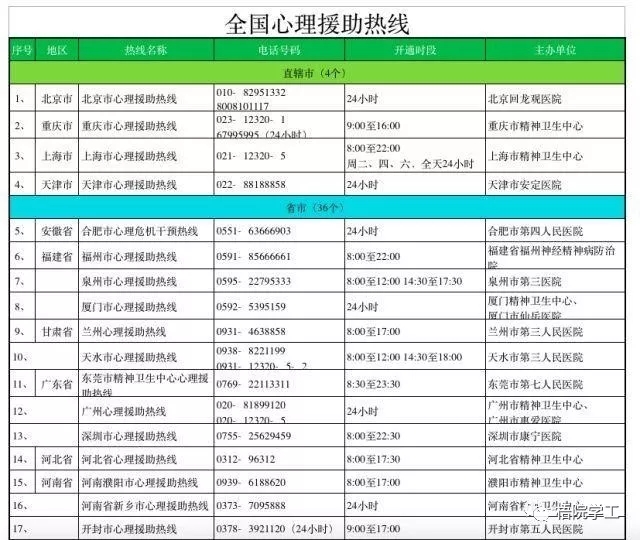 希望我们能够做到张弛有度,积极自我调适,及时化解恐慌、焦虑情绪,保持自信、阳光心态。如有心理困惑,可拨打全国新冠肺炎心理支持热线4001-888-976,或附表列表中各省市心理援助热线。