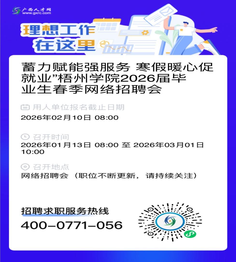 为贯彻落实国家教育部、教育厅关于做好普通高校大学毕业生就业工作的指示精神,积极主动做好我校毕业生就业推荐工作,拟于定于2026年1月22日至3月1日开展“蓄力赋能强服务 寒假暖心促就业”梧州学院2026届毕业生春季网络招聘会,现将有关事项通知如下: