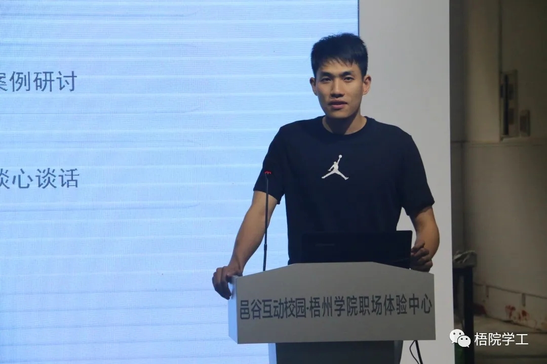 培训会邀请电子信息与工程学院辅导员周源老师作大赛的专题培训。他分享大赛的干货和交流经验。辅导员素质能力大赛包括笔试、谈心谈话(主要三点迅速破题、把握主动、谈话技巧)、案例研讨这三个部分。