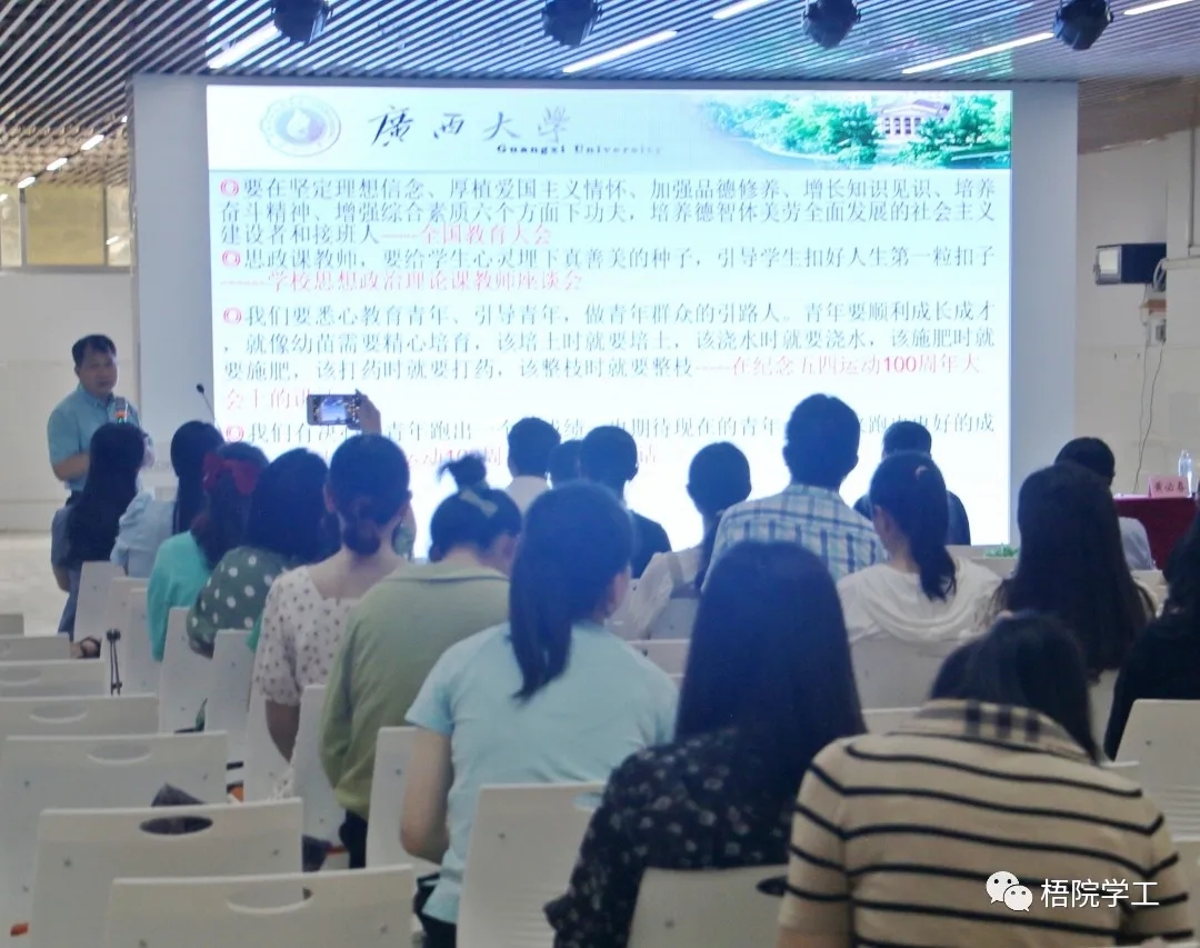 为提升我校辅导员工作水平,加强辅导员队伍建设,增强辅导员工作的责任感和使命感,5月12日,学校邀请到辅导员能力提升专家、广西大学学生工作部(处)部(处)长黄必春到我校体育馆负一楼大学生就业指导中心开展“新时代辅导员的使命担当与成长锻炼”专题讲座。学生工作部(处)领导,各二级学院分管学生工作的领导出席讲座,全体辅导员参加讲座。