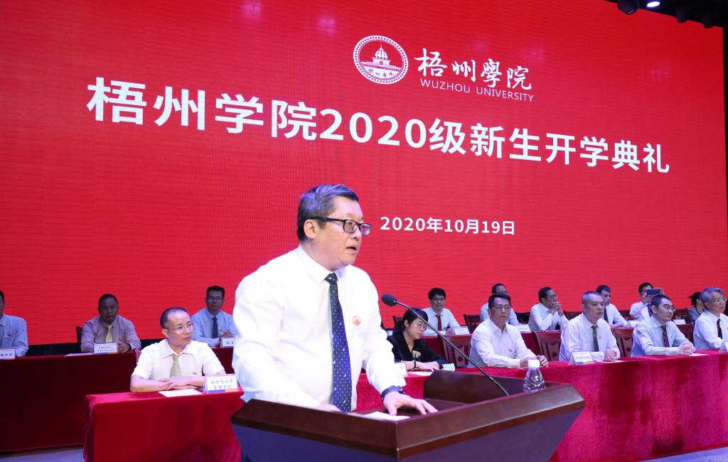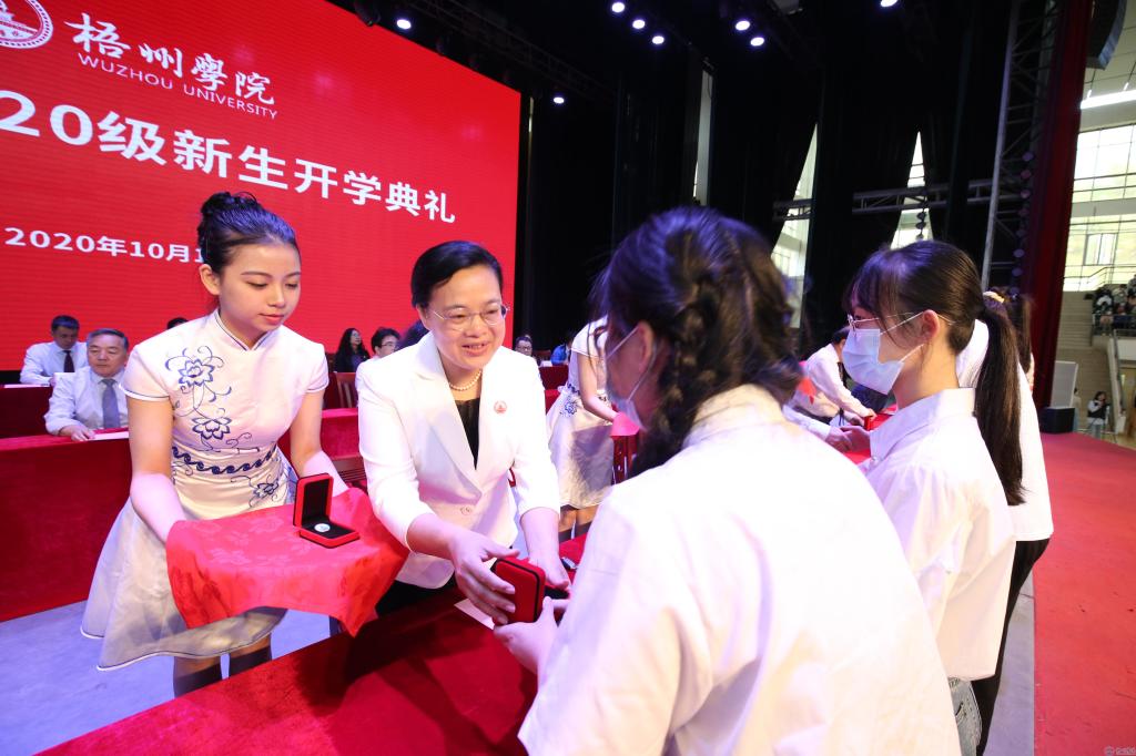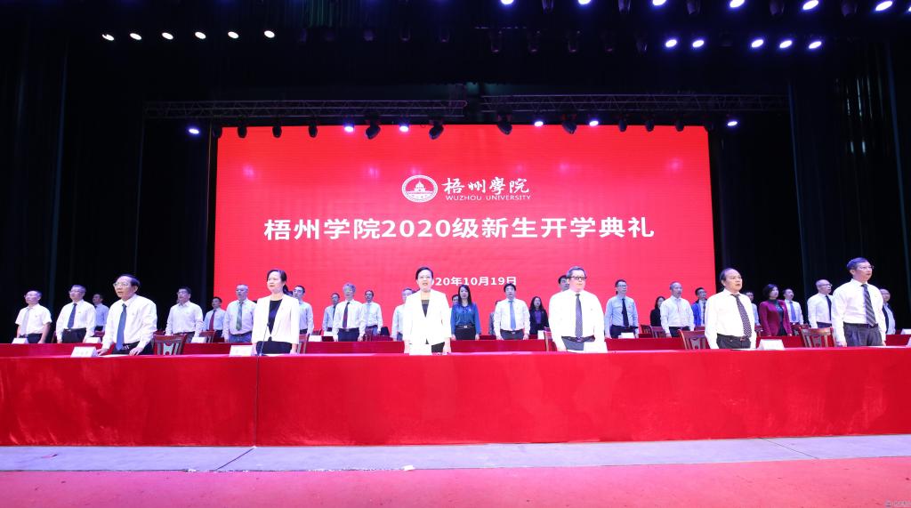 开学典礼随着庄严的国歌奏起拉开序幕。随后,学校领导在校歌的乐声中,为2020级新生代表授予校徽,欢迎他们加入梧院大家庭。