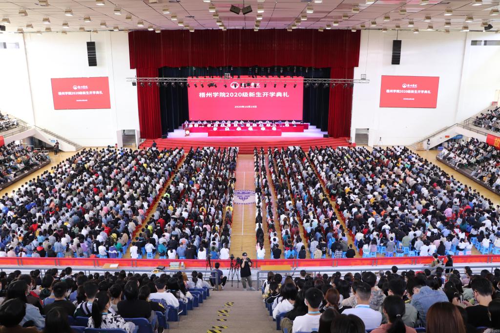 10月19日上午,我校2020级新生开学典礼在北校区体育馆三楼主会场举行。学校领导韦仕珍、杨奔、曹迎、玉振明、邱房贵、麻新纯出席典礼。校属各部门和各二级学院主要领导、新生辅导员,与来自全国27个省、市自治区的5000多名新生及家长代表参加典礼。开学典礼由党委副书记曹迎主持。