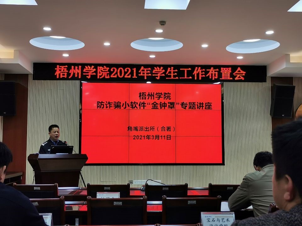 3月11日下午,我校邀请梧州市公安局角嘴派出所警长到校开展防诈骗小软件“金钟罩”专题讲座。角嘴派出所警长覃焕新从“金钟罩”防诈骗小软件的防范机制和案例分析两个方面开展讲座。他表示,“金钟罩”防诈骗小软件是梧州公安局精心准备,隆重推出防诈骗神器。注册“金钟罩”防诈骗小软件,可以被动地阻隔网络诈骗团伙对个人无差别的轰炸、引诱等诈骗信息,能够有效地防范诈骗案的发生。