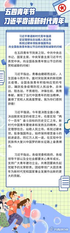 在五四青年节到来之际,中共中央总书记、国家主席、中央军委主席习近平代表党中央,向全国各族青年致以节日的祝贺和诚挚的问候!