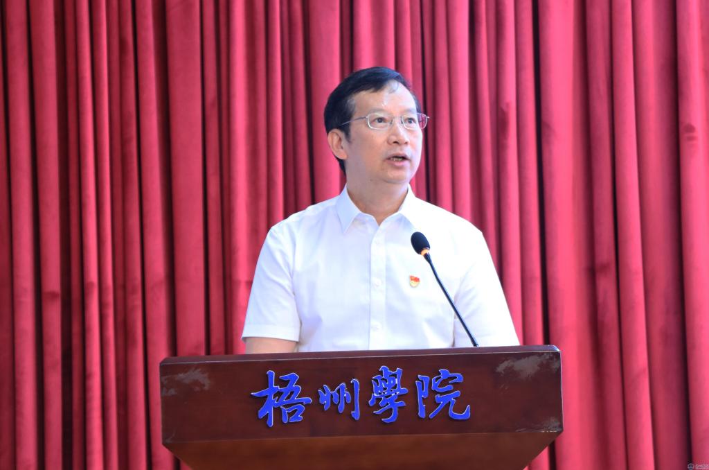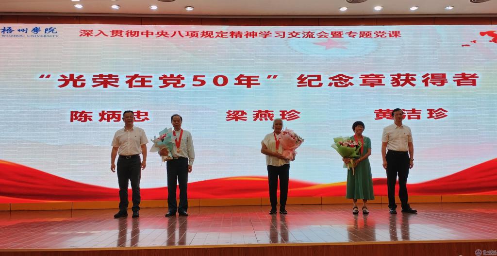 主题党课前,校党委书记童晓晖、校长麻新纯为陈炳忠、梁燕珍、黄洁珍同志颁发“光荣在党50年”纪念章。“光荣在党50年”纪念章获得者代表陈炳忠,年轻干部代表科研处副处长、社会科学研究处副处长(兼)庞光垚,全区高校“三全育人”综合改革示范院系代表电子信息与人工智能学院党委书记韦衡冰,广西党建工作样板支部代表机关党委学工团委党支部副书记秦伟依次作“学精神 讲实干 破难题 促发展”主题交流发言。