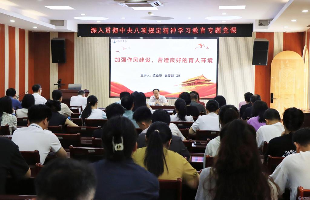 6月26日上午,学校党委副书记梁业华在明理楼七楼视频会议室,以《加强作风建设,营造良好的育人环境》为题为分管部门、联系二级学院干部、党员讲授深入贯彻中央八项规定精神学习教育专题党课。